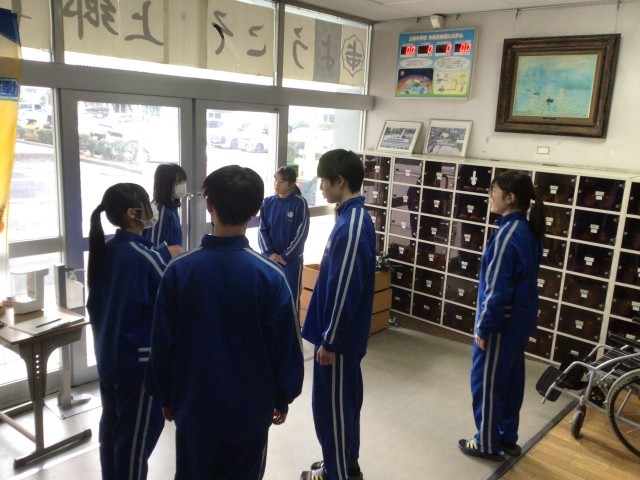 帰りの会後、卒業式に受付を担当することになった2年生の生徒が、昨年度行った3年生から説明を聞いていました。