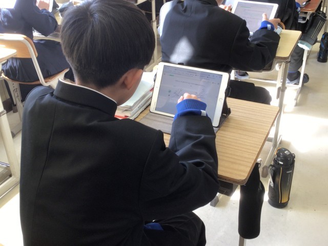 授業の冒頭、Qubenaを使って、練習問題を進めていました。