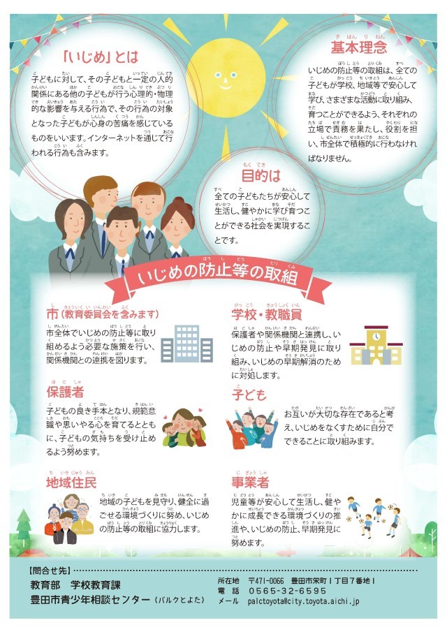 豊田市では、地域社会全体でいじめの防止等に取り組み、全ての子どもが安心して学び育つ社会の実現するため、「豊田市いじめの防止等に関する条例」を制定しましたので、チラシを掲載しお知らせします。市、学校・教職員、保護者、子ども、地域住民、事業者が基本理念を共有し、互いに連携しながら、いじめの防止等に取り組んでいくものです。条例は、令和8年4月1日施行です。