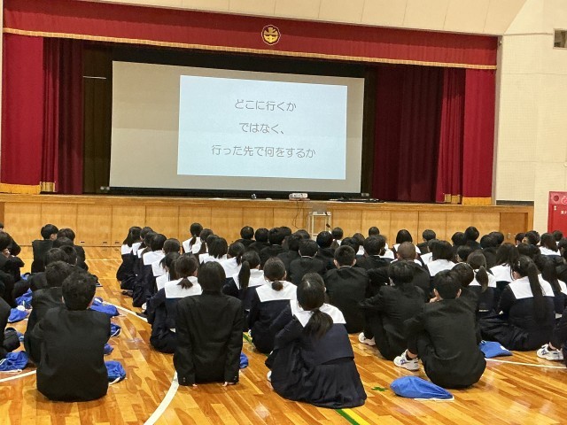 学年主任からは、学年だよりタイトルの副題「自分自身で舵を取り、想像以上の人生を歩むための力」を取り上げ、いよいよ「舵を切る」「舵を取る」時期になってきたこと、そして、自分自身に「舵を切れ・取れ」と言えるような一年にしてほしいという願いが伝えられました。また、進路指導主事からは、進路を決めるのは自分自身であり、大切なのはどこに行くかでなく、行った先で何をするかであるという話がありました。3年生の様子からは、真剣に、自分事として受け止める様子がうかがえました。