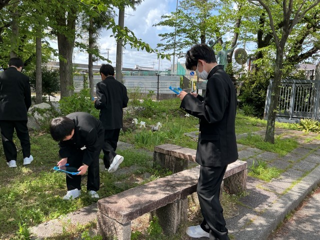 理科の時間には、校内の植物探検を行いました。新しい学習用タブレットを使って、植物の写真を撮影していました。
