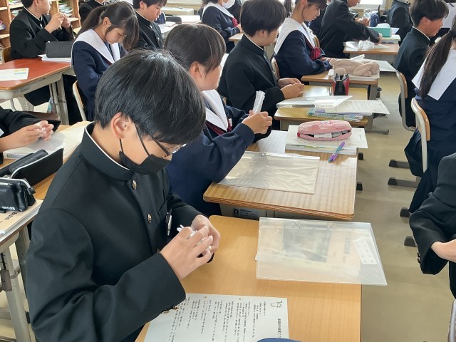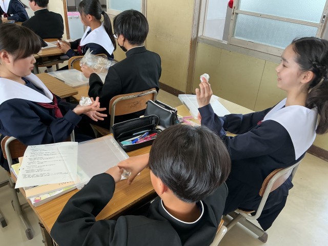 家庭科では、授業の進め方のお話をきいたあと、学習の終わりに出たごみをできるだけ小さくまとめようとしていました。折りたたんだり結んだりして、工夫していました。