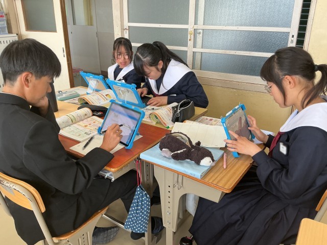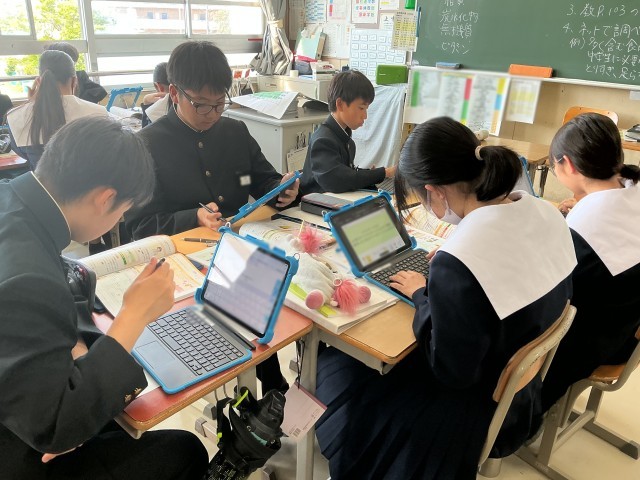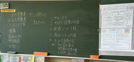 家庭科の授業では、五大栄養素の学習をしています。タンパク質、脂質など、栄養素について全体で確認した後、班で分担して、その栄養素を多く含む食品や、中学生が摂り過ぎていたり、不足していたりする栄養素について調べ学習をしていました。学習用タブレットで調べたことは、発表ノートにそれぞれがまとめています。調べ終わったところで班で発表し合い、一つのノートにまとめる予定です。
