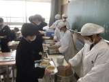 給食の配膳の様子です。 どのクラスも身なりを整え、手際よく配膳していました。
