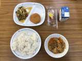 今日の給食は、月見献立でした。 麦ごはん、豚丼の具、さといもコロッケ、おかかあ...