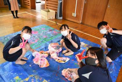 学年旗作成 公開日 2021/04/22 更新日 2021/04/22 各学年から 学年の旗を作成しました。1年生234人の手形をとって、学年スローガン「ACTION」を型取りしました。完成が楽しみです。