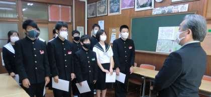 校長室で、令和の新しい学校づくりをリードしてくれる生徒会議長・委員長、級長の任命を行いました。