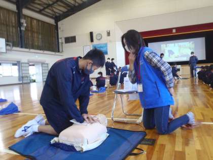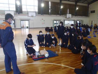 消防署の職員と応急手当インストラクターさんを招いて、応急手当講習を行いました。生徒のお礼の言葉にもありましたが「私たちが心臓マッサージやAEDの使い方を知ることで助かる命がたくさんあること」を知ることができました。生徒と共に勇気ある行動ができるように今後も安全教育、指導を継続していきます。