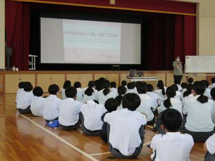 5月27日(金)にハートフル集会がありました。講師の方から、中学校生活をより充実に送れるように、心のコントロールの方法などを学びました。生徒達は真剣な表情で話を聞いていました。