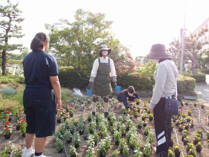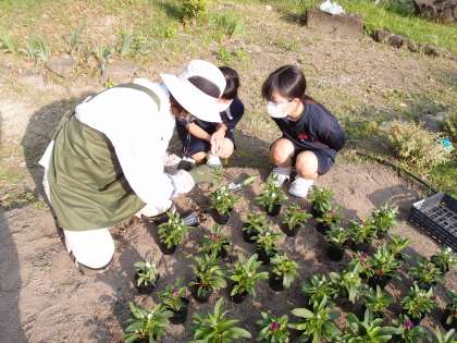 6月10日、園芸部が、地域コーディネーターの方と一緒に、大勇門前のメイン花壇の苗植え作業を行いました。
