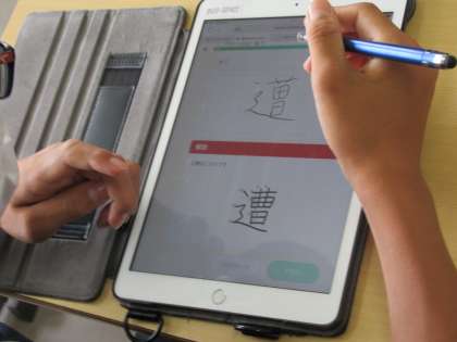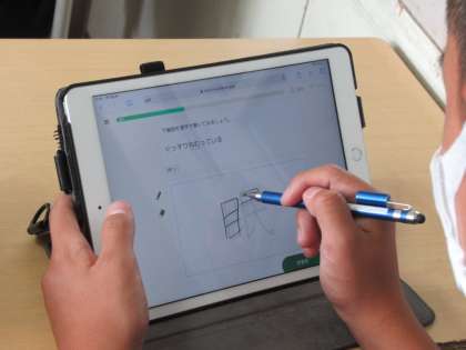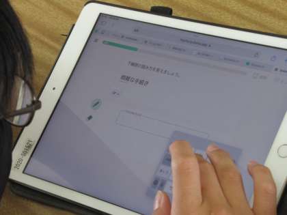 写真は国語の授業でQubenaを使用している様子です。クイズ形式で問題を解いたり、画面上に漢字を書いたりしながらそれぞれのペースで個別に学んでいます。生徒個々のデータは記録されるため、一人ひとりのつまずきや進度を把握し、授業に生かすことができます。
