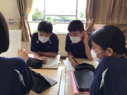 9月末に実施するALTを複数招待して行う授業に向けて、英語の授業ではプレゼンテーションのリハーサルを行いました。タブレットを使用して自分の取り組んできたものや興味のあることを1人ずつ英語でプレゼンテーションします。リハーサルでは緊張した表情をうかべつつも、グループの仲間にアドバイスや質問をもらう際には笑顔も多くみられました。リハーサルを通して、より良いプレゼンテーションになるよう、さらに練習をしていきます。
