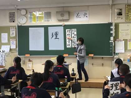 書初め大会に向けて講師に羽根田様をお迎えして、書初め練習を行いました。細かい書き方の説明や注意するポイントなど、とても分かりやすく教えていただきました。生徒も集中して書いていました。本番がとても楽しみです。