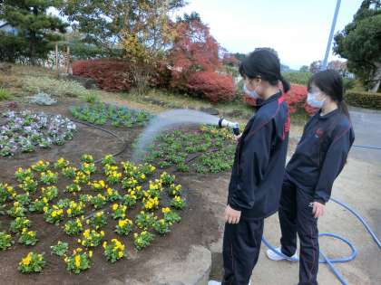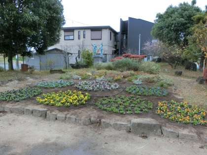 去る11月20日に、地域コーディネーターの方と一緒に、大勇門前のメイン花壇の苗植えを行いました。