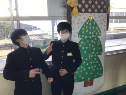 3年部では、各クラスでクリスマスツリーの掲示物を作成しました。特に見事な掲示物を作成している3組の生徒にインタビューをしたところ、「やはり廊下が華やかだと雰囲気が明るくなるので、掲示物作りを頑張りました」「みんなの笑顔を見るのが大好きだからです」と言っていました。今後も生徒が気持ち良く生活できる環境づくりを生徒とともに創っていきます。