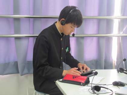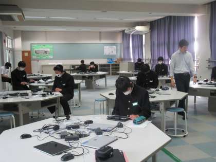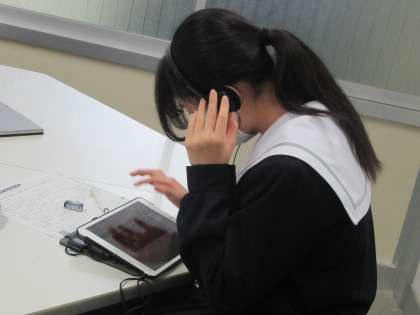 18日に国語・数学・英語の3教科が実施され、21日は英語「話すこと」、「生徒質問紙」を学習用タブレットを用いて行いました。話すことでは、各学級3グループに分かれ、順に集中してヘッドセットを使って英文を聞き取り、解答を録音しました。