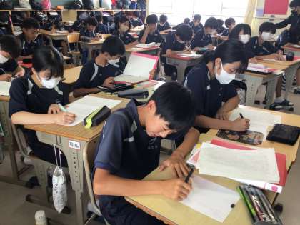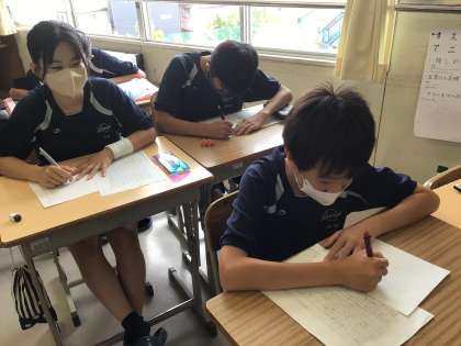 職場体験学習を受け入れてくださった事業所にお礼の手紙を書いています。国語科「表現を工夫して書こう」で学習した手紙の書き方や表現の仕方を使って、丁寧に書いています。手紙とともに貴重な経験をさせてくださった感謝の気持ちも届けたいと思っています。