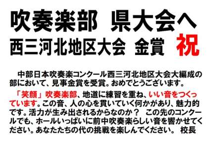 「笑顔」吹奏楽部が、中部日本吹奏楽コンクール西三河北地区大会大編成の部で金賞を受賞し、県大会に進むことが決まりました。おめでとうございます。