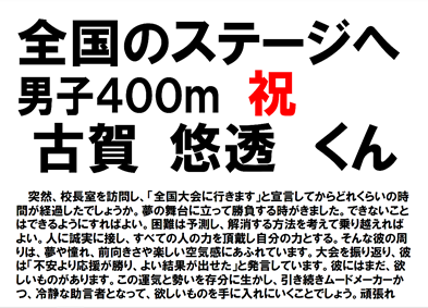 古賀悠透くんが、全日本中学校通信陸上競技愛知県大会において、400mの種目で全国大会出場標準記録を突破し、「全国」への切符を手にしました。おめでとうございます。本人は、まだどうしても手に入れたいものがあり、それを全力で取りにいくようです。