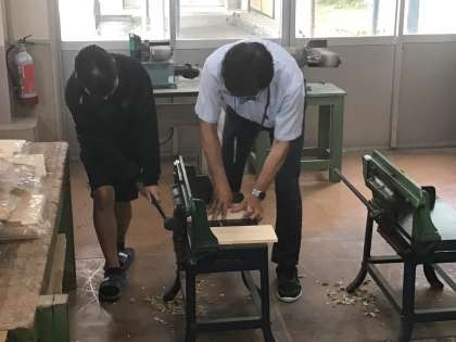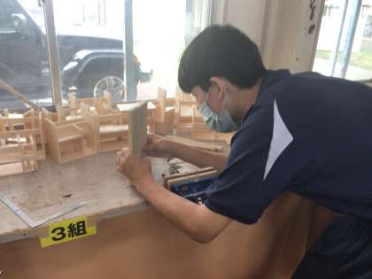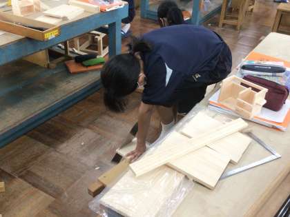 まず、使用する場所や目的を考え、構想図や部品図をかきます。断熱材を用いて実際の寸法の1/2の模型を作り、設計が正しいかどうかや今後の作業手順などを確認します。その後、工程ごとに各生徒ごとに学習課題を立て、木材を加工しながら作業に臨んでいます。この単元では、作品の設計と製作を通して、身の回りや社会の問題を解決する力を育んでいます。
