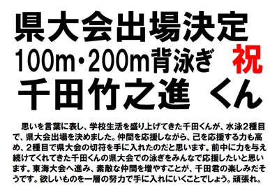 千田竹之進くんの、水泳での2種目県大会出場が決まりました。おめでとうございます。上位大会へ進み、たくさんの魅力ある人と出会い、交流することを楽しみにしているといいます。人はこうして成長していくのですよね。校長室を訪問し結果と目標を力強く語ってくれた千田君の、人としての成長を本当にうれしく感じました。