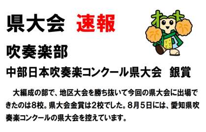 県大会速報 公開日 2023/08/01 更新日 2023/08/01 活動のようす 日々笑顔で成長を続ける吹奏楽部です。 今日よりも明日、明日よりも明後日。そして、5日には、さらに魅力的な演奏を響かせてくれることでしょう。 1年 2年 3年 特別支援学級 部活動 活動のようす