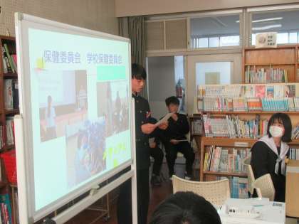 10月27日(金)の5時間目に第2回学校保健委員会が開かれました。「本校生徒とメディアの付き合い方の問題点と対策(メディアコントロール)」について、生徒会役員と保健委員会の代表生徒が、学校医の先生方や保護者の代表の方と協議を行いました。また、教室でも同じテーマで班ごとに話合いを行いました。