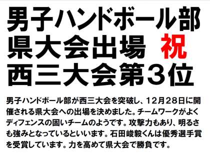男子ハンドボールの選手たちが校長室を訪問して、西三大会の結果を報告してくれました。県大会出場、おめでとうございます。質の高い勝負を存分に楽しんできてください。