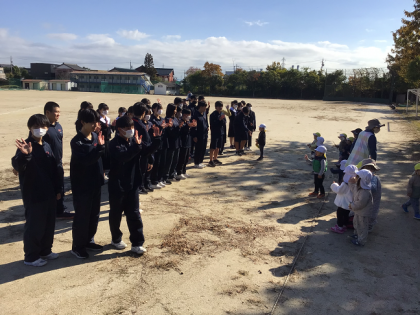 3年生の生徒が、どんぐりがたくさん落ちている場所へ案内し、一緒にどんぐり拾いをしていました。中学生は優しく、笑顔で園児と触れ合っていました。自分の得意とするお絵描きをしたり、落ち葉で思い切り遊んだりと、工夫を凝らして遊ぶ姿も見られました。最後は手を振ってお別れをしました。