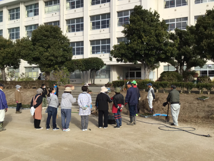 お二人の地域コーディネーターさん、民生委員の皆様、交流館自主グループの皆様、市議会議員の石川様を始めとするたくさんの地域の皆様のご協力により、グランドまわりの土手に、グランドカバーとなる宿根草を植えました。昨年度までは、春から秋にかけて植込からハチやヘビが現われ、危険を感じることがありました。そこで、今春、植込を校内整備員さんのお力で撤去していただきました。さらに、体育祭や運動場での活動の様子を見やすくするために垣根の刈り込みも行っていただきました。