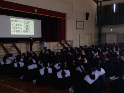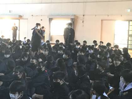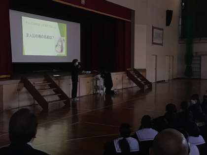 環境美化委員は、大掃除に関するクイズなどを交えて発表を行いました。上から掃除するといいことなどを学ぶことができたので、学校だけではなくさまざまな場所で生かし、美しい環境作りができることを期待しています。