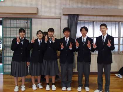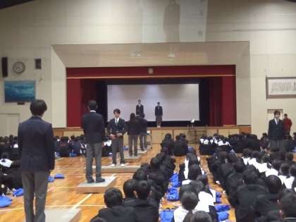 1月11日の朝集会で、全校生徒に向け新制服のお披露目を行いました。