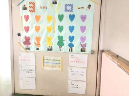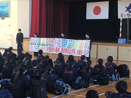 先週に自然教室にむけて学年集会を行い、級長が、生徒の「なりたい自分」を書いた横断幕を披露しました。今週は自然教室、最高学年にむけて「時間」について目標をたてて行動しています。それぞれのクラスがたてた目標を意識して行動する姿が見られました。来週からも「自分から行動」を意識して行動する姿に期待しています。