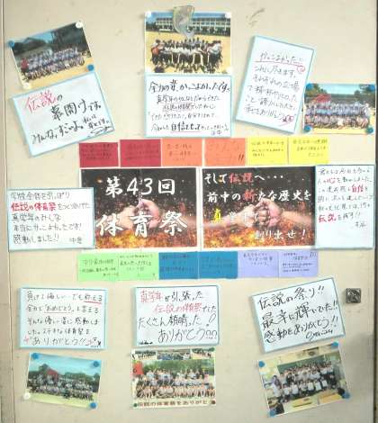 体育祭後に作られていた校内の掲示の一部です。体育祭への取組の価値を再認識するような集会なども開かれていました。心を通い合わせてみんなで創り上げた体育祭であったことを実感します。校内の掲示コーナーでも思いの交換がなされていて、心が熱くなります。