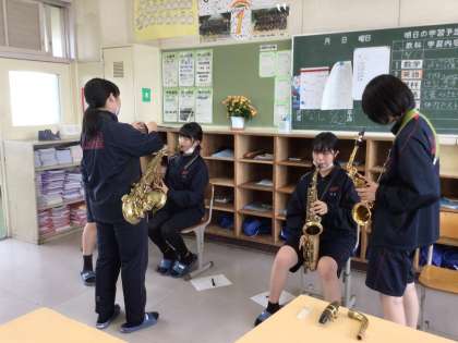 どの部活でも、先輩が優しく丁寧に指導してくれるおかげで、1年生は楽しそうに活動をすることができています。吹奏楽部では、初めて触れる楽器にやや緊張気味でしたが、音が出るとともに笑顔がこぼれていました。三年間継続して、自分の世界を広げてほしいです。