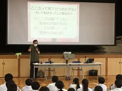 こころの状態をペットボトルとコーラに例えたり、呼吸法やツボでこころを落ち着けたりと楽しく学びました。生徒にとって思春期の中で抱えるストレスとどう向き合うかを考えるきっかけになりました。