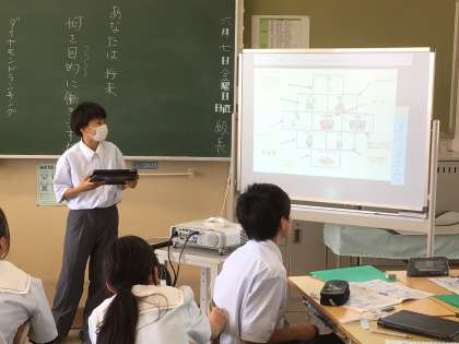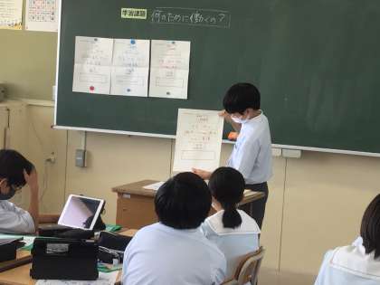 6月7日(金)の総合的な学習の時間の授業では、「何のために働くのか?」というテーマでやりがいやライフスタイルなど様々な視点で何を重視するのか話し合い、ランキング形式でまとめました。お金をあげる意見も多い中、人間関係を上位にあげる意見も多く、人とのつながりが仕事に関わっていると考えている生徒がたくさんいることが分かりました。今後は調べ学習や適性検査などを通して働くことについて考えをさらに深めていきます。