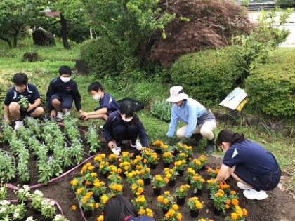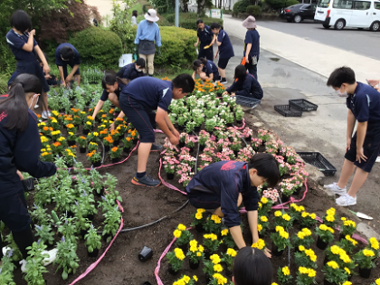 メイン花壇に花苗を植えました。先週から花苗の植栽のために園芸部が、草をとって花壇をきれいにしたり、土を耕したりして、準備を進めてきました。今回は新1年生も加わり、経験のある2、3年生や、地域コーディネーターから植え方を教わりながら、部員全員で協力して植えていました。植え終わった花壇について、地域コーディネーターの方から、植え方が大変きれいとのお言葉もいただきました。
