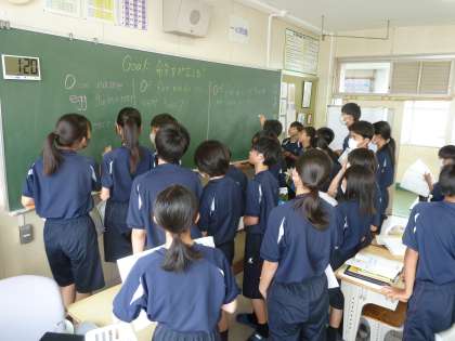 外国語科の授業では、英語の命令形を使って先生や友達に指示を出すゲームや英語でしりとりを行いました。みんなで和気あいあいと関わり合いながら楽しく英語を学びました。