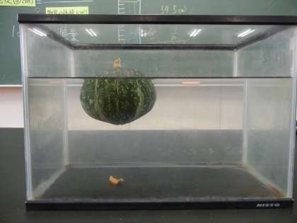 大きな丸ごとのカボチャは浮くのに、小さく切ったカボチャは沈んでいます。