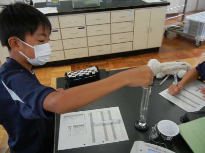 理科の「密度」の授業です。生徒たちはこの現象を不思議に思いながら密度の大きさで水に浮いたり、沈んだりすることについて学びました。