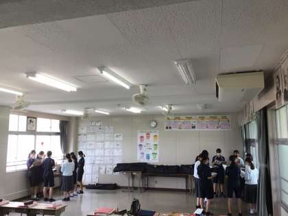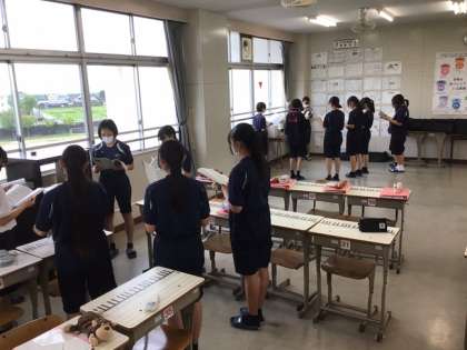2年生の学年合唱は「時の旅人」です。7月に入り、音楽の授業の時間で学年合唱の練習が始まっています。この曲は、ソプラノ、アルド、男声の、どのパートにも主旋律となる部分が存在するため、曲の中での自分の役割をしっかりと理解しながら歌うことが大切です。