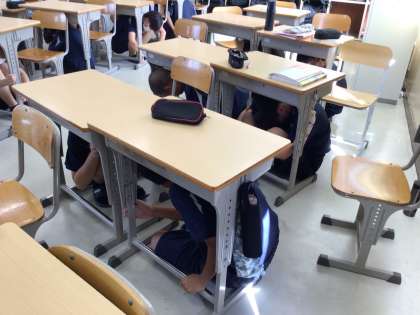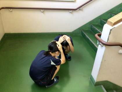 今日は地震発生時に、いつでもどこでもシェイクアウトが行えるよう、時間を指定せずに避難訓練を行いました。普段と違うタイミングで緊急放送が流れたため、戸惑いながらもしっかりと頭を隠したり、窓から離れたりするなど、落ち着いて対応できていました。