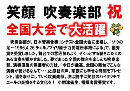 吹奏楽部 全国大会で優秀賞を受賞 公開日 2024/11/04 更新日 2024/11/04 活動のようす 吹奏楽部が、日本管楽合奏コンテスト全国大会に出場し、優秀賞を獲得しました。おめでとうございます。校長室の窓に掲示するおめでとうメッセージです。 1年 2年 3年 特別支援学級 部活動 活動のようす
