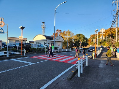 今日は運用初日で、多くの自治区の方々に立哨をしていただきました。通行する生徒は、不安ながらも一旦停止して、自転車を降りて、立哨されている方から説明を受けながらボタンをおし、左右確認をして渡っていました。