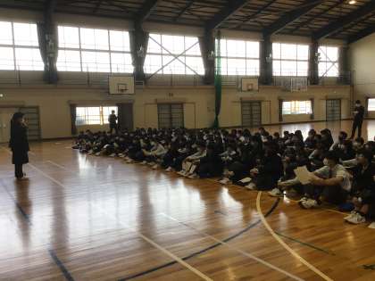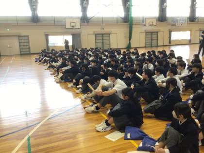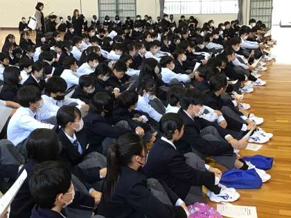 2年生の生徒会執行委員やスタッフ活動実行委員の生徒から、祝う会に向けての説明がありました。今まで学校を引っ張ってくれた先輩たちが最高の気持ちで卒業できるよう、1年生も2年生と力を合わせて祝う会を作り上げていきます!1年生がより成長するためのチャレンジです!