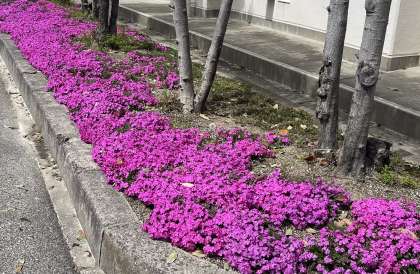 一昨年度の生徒会役員が、「後輩たちの新しいスタートを満開の花で迎えてあげたい」という思いで植えてくれた芝桜がもう少しで満開を迎えようとしています。