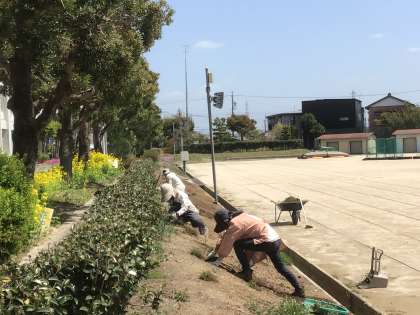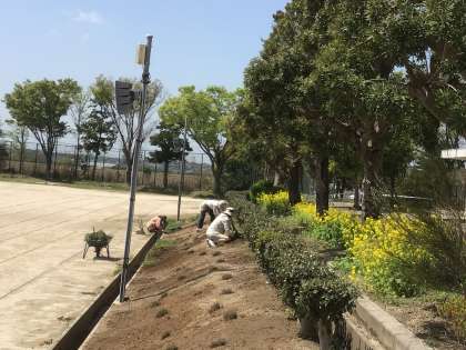 グランドカバーを植える準備をしています。前中応援隊に登録をしているボランティアの方と、園芸部の生徒で、花苗を植える予定をしています。地域学校共働本部と校務支援員で、植栽ができるよう除草作業をしてくださっています。ありがとうございます。