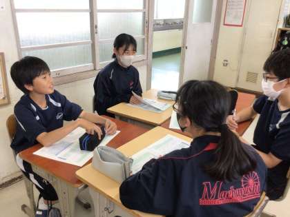 1年生の総合的な学習で進路コンパスを使って、なりたい自分について考えました。幼稚園や小学校時代の将来の夢を振り返ったり、身近な職業について話し合ったりすることで、進路や職業への興味や関心を高めることができました。