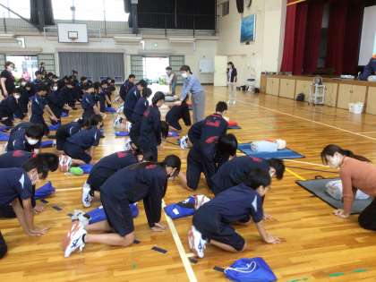 生徒たちは、人形を使って心肺蘇生の練習やAEDの使い方の確認を行いました。実際にやってみると上手くできず苦戦している姿も見られましたが、どの生徒も真剣に応急手当の方法を学んでいました。